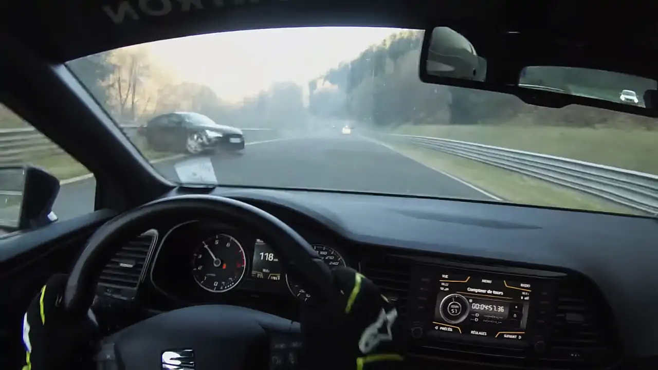 Aujourd'hui, la scène est encore plus extraordinaire et les pilotes méritent nos applaudissements. Elle est filmée par une SEAT Leon Cupra qui enchaîne furtivement les virages. Le pilote de la SEAT Leon Cupra se fait doubler par une Audi TT RS. Quelques mètres plus loin, cette Audi TT RS glisse sur une flaque d’huile et le conducteur perd totalement le contrôle de sa voiture.