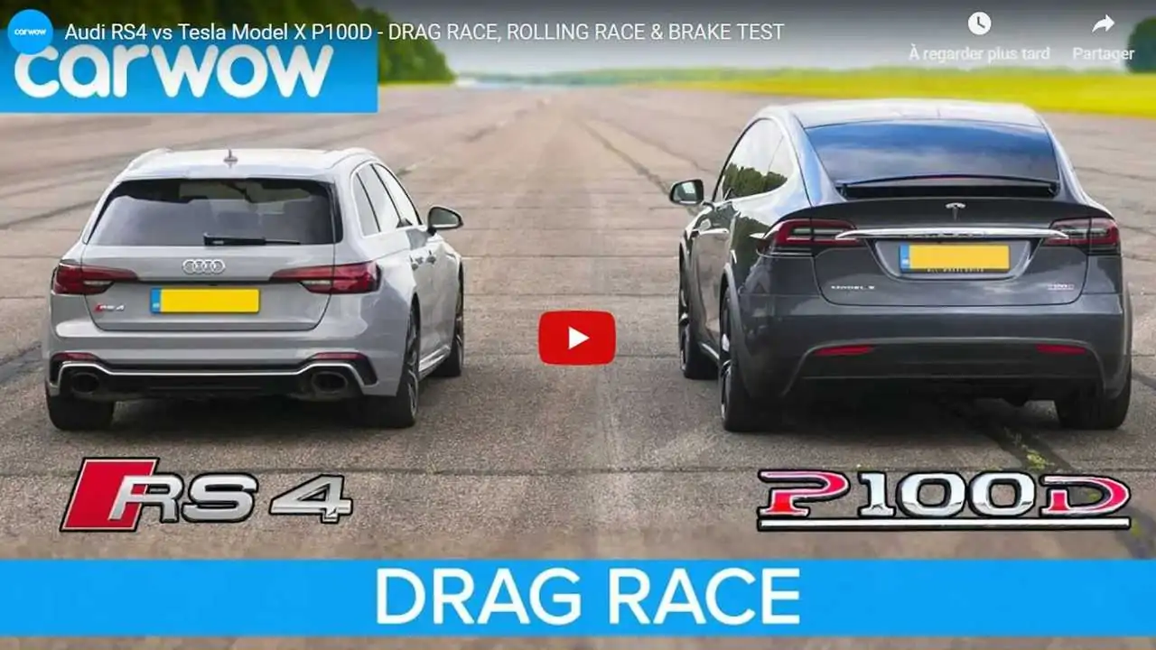 Les Tesla sont de redoutables voitures électriques à l'épreuve du Drag Race. Cette discipline consiste à accélérer et à rouler le plus vite possible sur une distance de 400 mètres. Une fois n'est pas coutume, la chaîne YouTube Carwow a réalisé un duel entre le Model X P100D et l'Audi RS 4 Avant. Le Model X est une voiture familiale pouvant transporter jusqu'à sept personnes. L'Audi RS 4 Avant est un break, lui aussi familial, pouvant rouler très vite dans les virages.