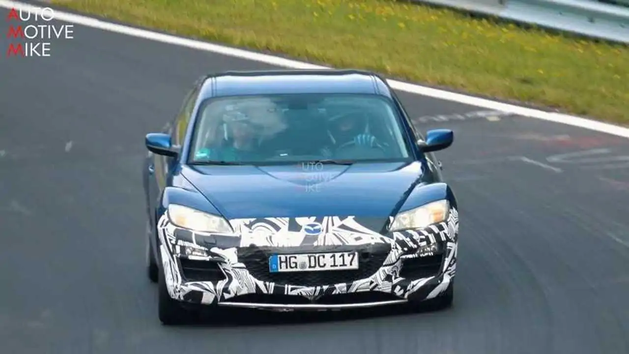 Oui, ce n'est pas la première fois que nous voyons une Mazda RX-8 au Nürburgring - nous avons déjà vu cette voiture d'essai durant cet été et un autre prototype très similaire il y a presque deux ans. Nous sommes surpris de voir le constructeur japonais revenir une fois de plus sur la piste légendaire avec la même voiture et cela soulève une question majeure : que fait Mazda avec cette RX-8 ?