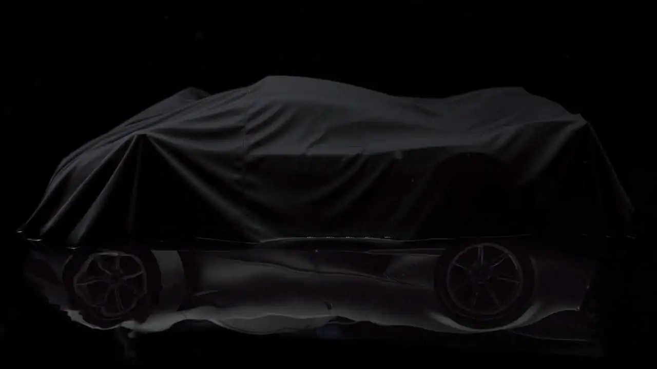 Encore entièrement bâchée, elle se présente de profil et ne laisse pas filtrer grand chose, si ce n'est évidemment quelques éléments aérodynamiques qui s'annoncent particulièrement massifs. À l'instar de l'immense aileron que l'on devine à l'arrière, ou encore ce qui pourrait être une entrée d'air sur le toit, un "scoop", deux éléments qui étaient déjà présents sur la feu Zonda R.
