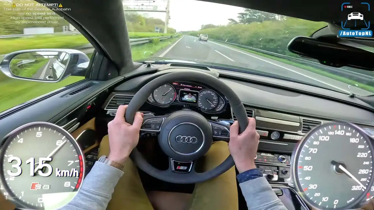 Lors d'un test de vitesse maximale sur l'Autobahn allemande, AutoTopNL a pu amener cette Audi S8 Plus 2017 à une vitesse indiquée de 315 km/h. C'est bien plus que la vitesse annoncée par le constructeur, 305 km/h.