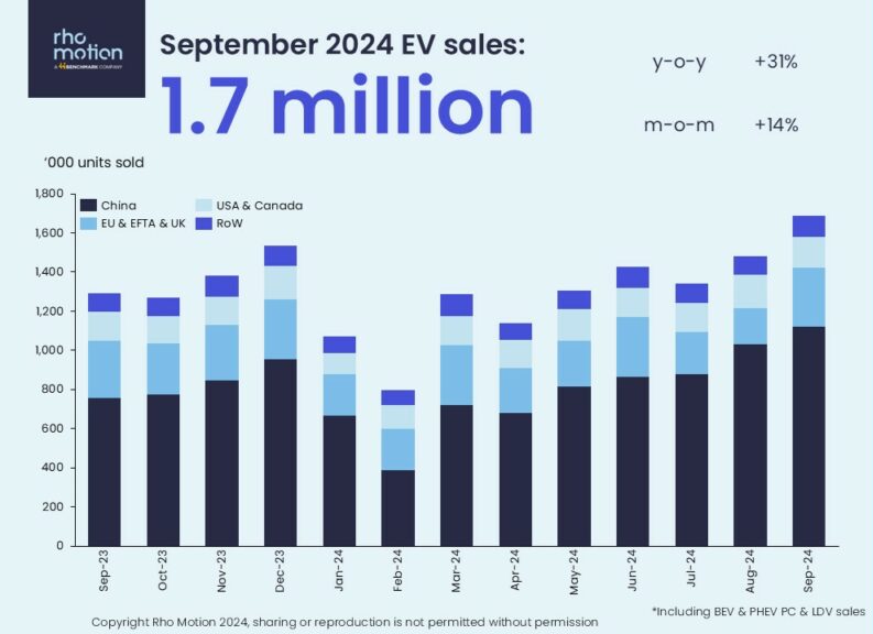 Le mois dernier, un nombre record de voitures tout électriques et hybrides rechargeables ont été vendues dans le monde, selon le cabinet d'études Rho Motion. En septembre, 1,7 million de BEV et PHEV ont été vendus dans le monde, soit une augmentation de 30,5 % d'une année sur l'autre et 150 000 unités de plus que le précédent record établi en décembre 2023.