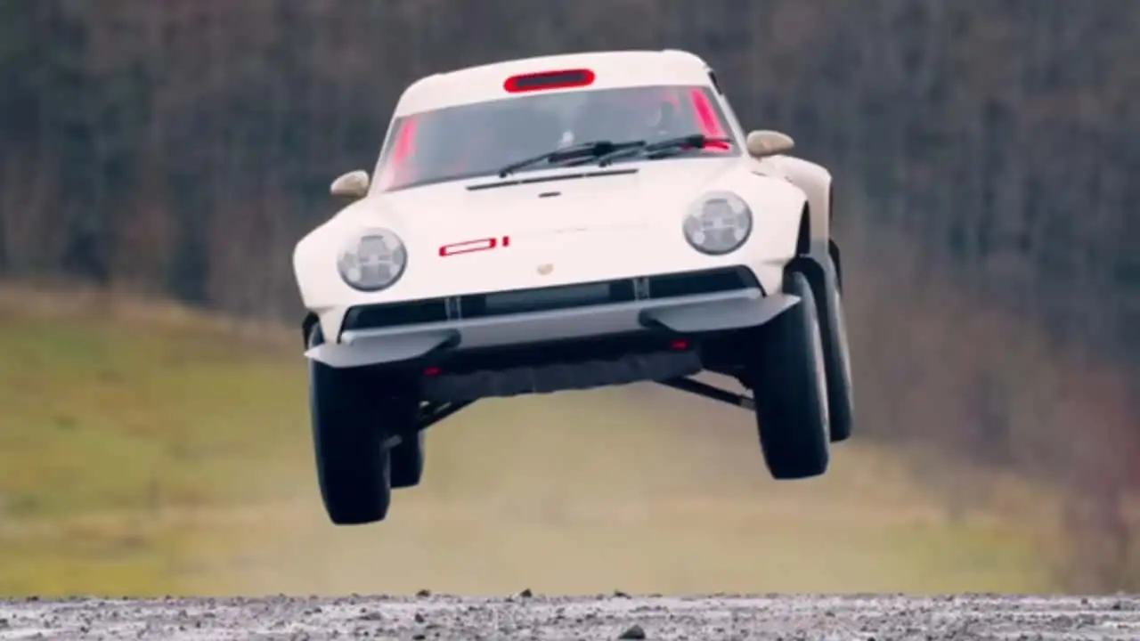 Pour rappeler ce qui rend cette voiture spéciale, l'ACS est basée sur une Porsche 964, mais les similitudes s'arrêtent généralement à la forme. Il est équipé d'un moteur six cylindres à plat de 3,6 litres à double turbocompresseur refroidi par air qui développe entre 450 et 600 chevaux, selon le réglage. Il entraîne les quatre roues grâce à une boîte de vitesses séquentielle à cinq rapports, et pour atterrir en toute sécurité après un saut, la suspension personnalisée a un débattement de 29,9 cm à l'avant et à l'arrière. La carrosserie est en fibre de carbone et l'intérieur est équipé d'une cage de sécurité complète.