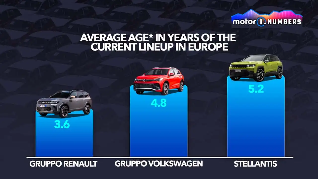 Enfin, la gamme Stellantis a enregistré un âge moyen de 5,2 ans, en incluant les deux derniers membres de la famille (Jeep Compass et Citroën C5 Aircross) et en excluant les générations précédentes. La moyenne est influencée par des véhicules utilitaires plus anciens (Peugeot Boxer, Citroën Jumper, Fiat Ducato), la Fiat Panda (introduite en 2011), la Jeep Renegade (dévoilée en 2014), entre autres.