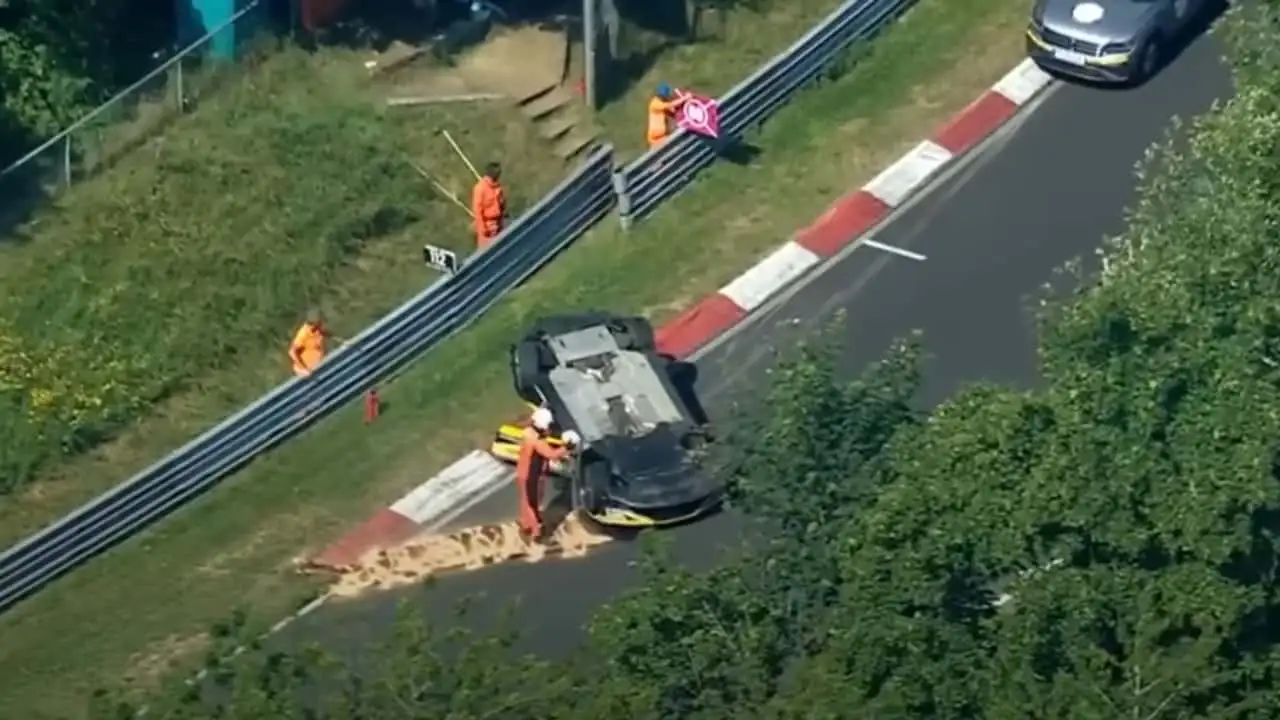 En voulant tracer sa route parmi les retardataires, Estre a tenté un dépassement sur l’Aston Martin Vantage GT4 de Rolf Schneibner, qui a maintenu sa trajectoire malgré la présence de la Porsche. Résultat : la 911 GT3 R poussait l’Aston sur le bas-côté, cette dernière rebondissait une première fois dans l’herbe, tapait violemment le rail de sécurité, avant de s’immobiliser sur la piste, sur le toit.