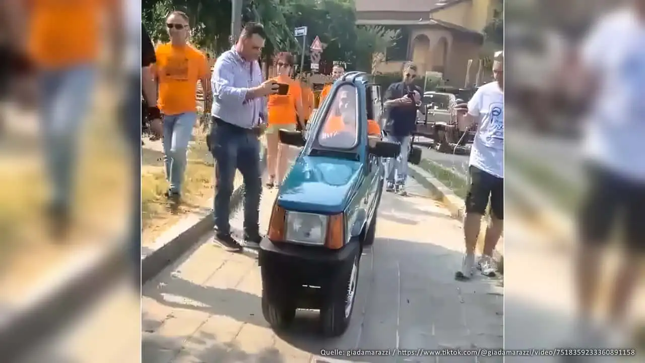 Heureusement, Marazzi est lui-même assez mince. Et comme on le voit clairement dans les vidéos, son Panda étroit n’a pas d’homologation routière. C’est bien dommage. Dans le prochain embouteillage ou à l’heure de pointe à Rome, l’extrême Fiat pourrait montrer ses avantages. En revanche, la susceptibilité au vent latéral n’est pas à sous-estimer. Ce n’est probablement pas sans raison qu’un accompagnateur marche à côté de la Panda dans la vidéo.