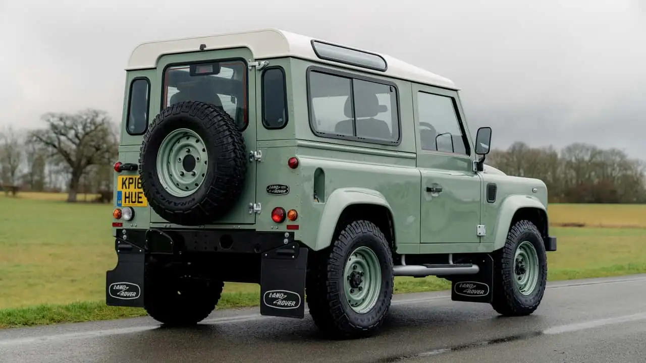 Fini avec l'emblématique Grasmere Green métallisé Land Rover et un toit Alaska White, il dispose d'une calandre et d'encadrements de phares au style Heritage, des jantes en acier renforcé assorties à la carrosserie, un pare-chocs avant métallisé, des vitres des clignotants transparentes et des charnières de portes Indus Silver.