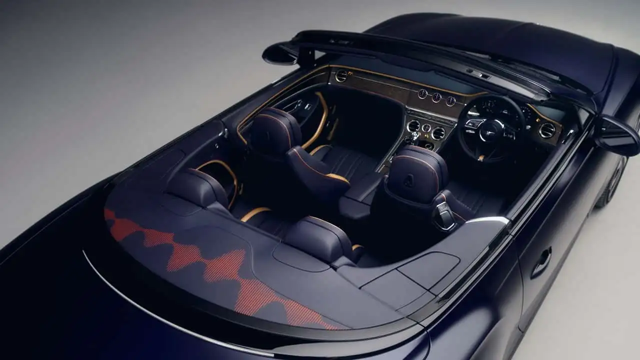 Ce cabriolet est le fruit de la mise en commun des idées et des expériences artistiques des trois protagonistes. Pour l’extérieur, Bentley a retenu une peinture satinée baptisée Peacock Satin, un bleu profond rehaussé de détails rouges Tornado Red sur le pare-chocs avant, le diffuseur arrière et les rétroviseurs. La même teinte bleue habille également les jantes de 22 pouces à dix branches, tandis que la capote est finie en gris foncé métallisé.
